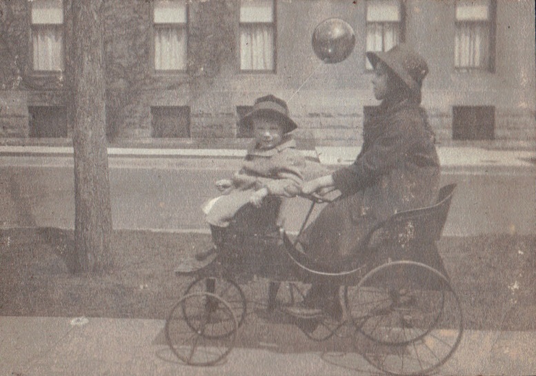 WDF riding in front of wheeled pedal car