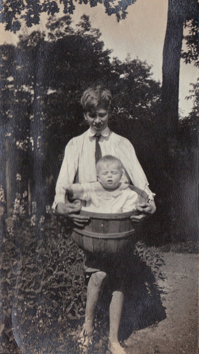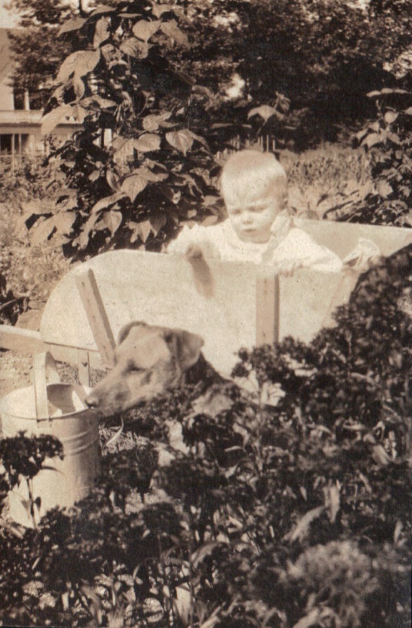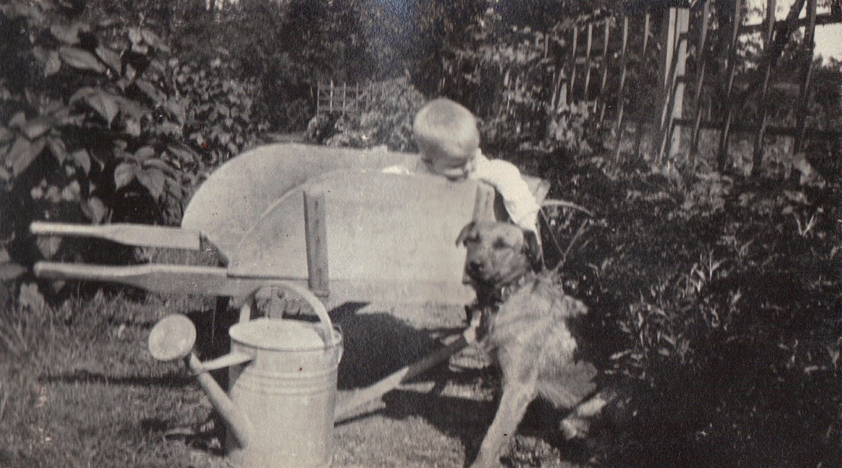 WDF in wheelbarro with dog and watering can