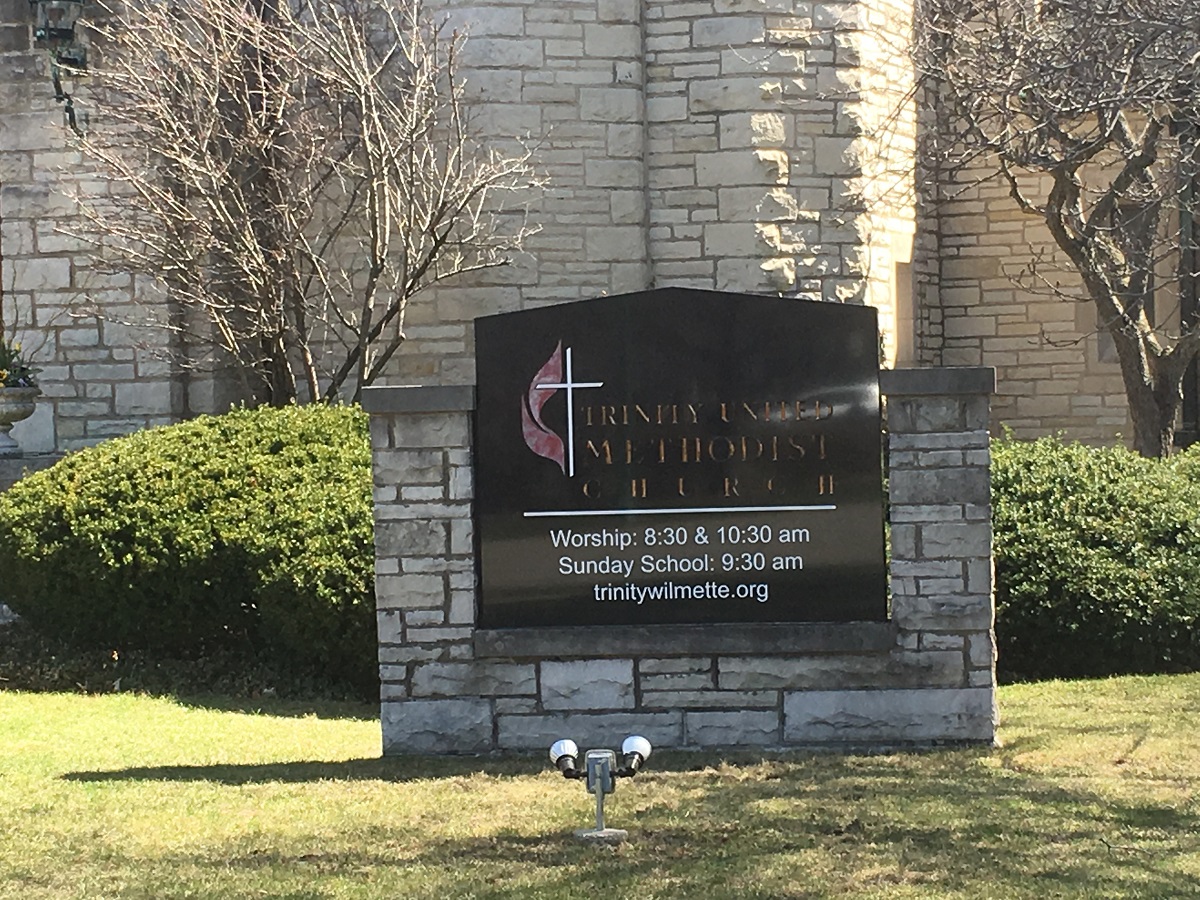 The sign of Trinity United Methodist Church -- as Andy walks from studio to Dr. Dukes' on April 8, 2019