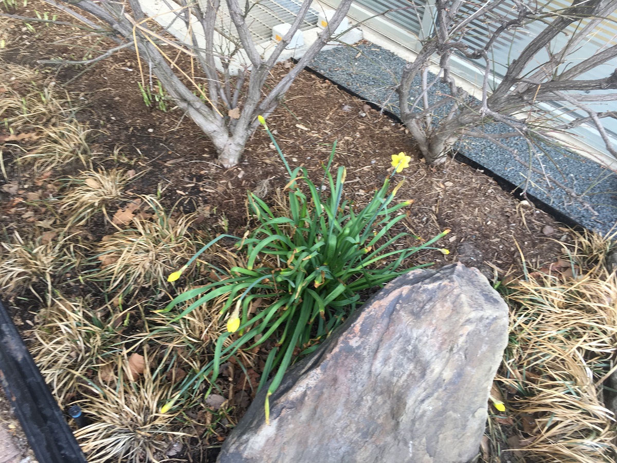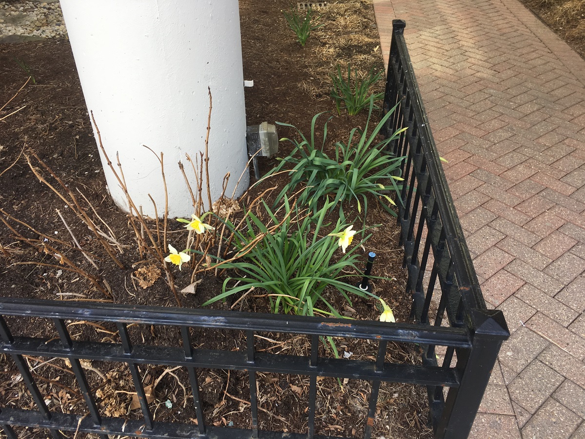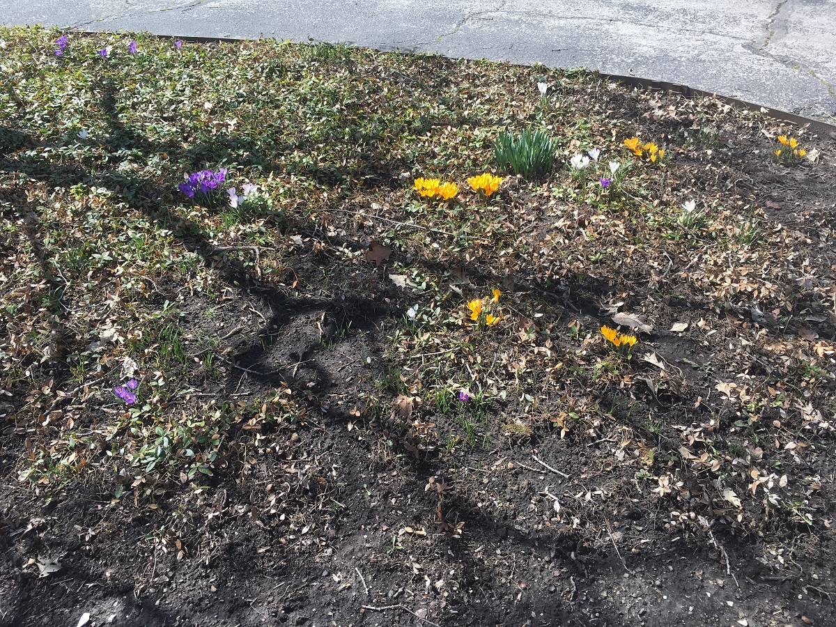 Crocuses along Sheridan Road as Andy walks from Plaza-de-Lago, home in downtown Evanston