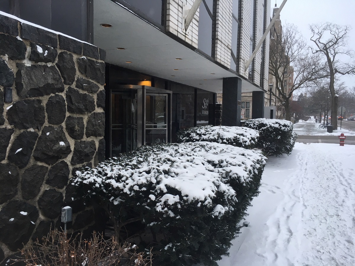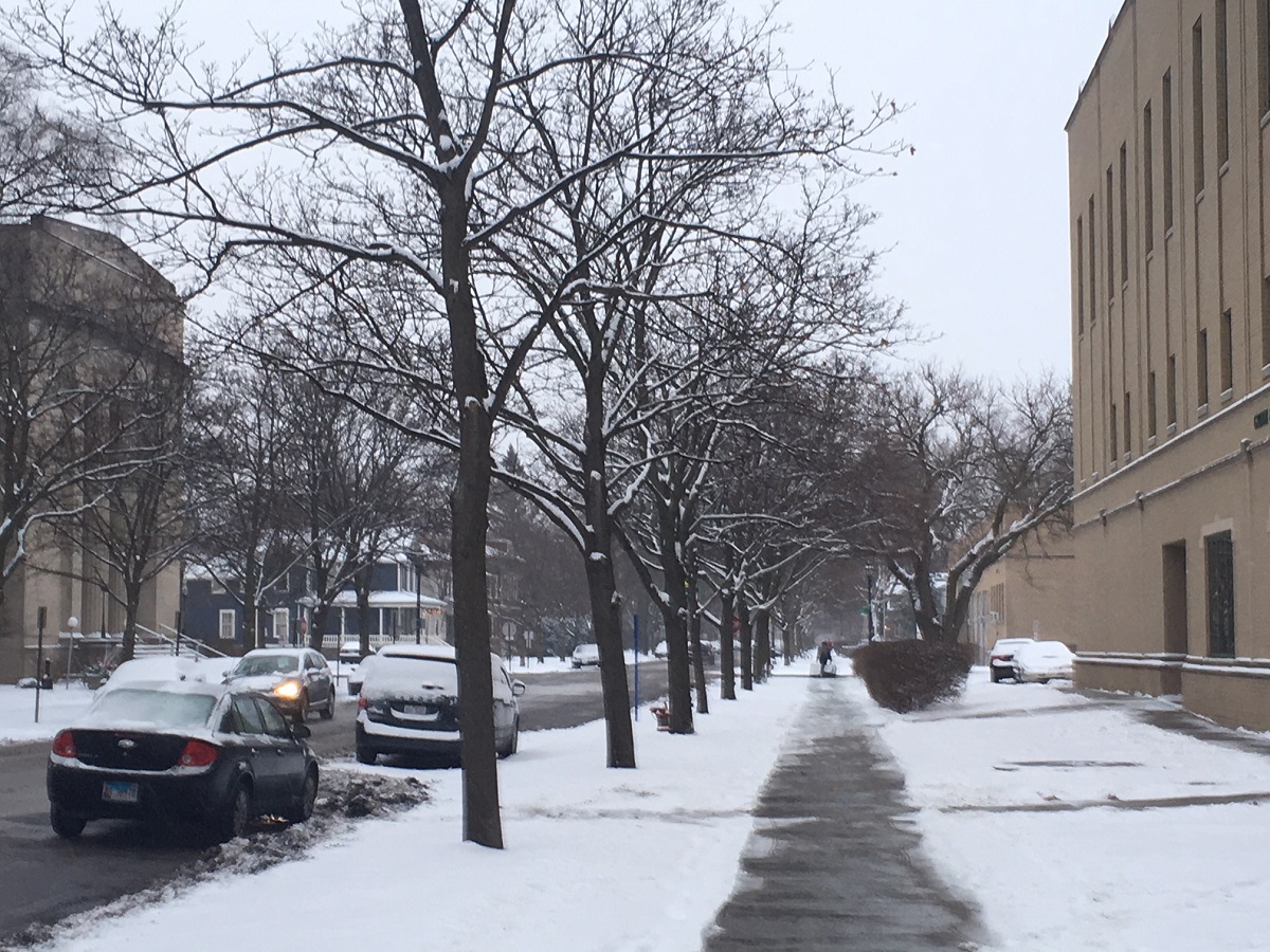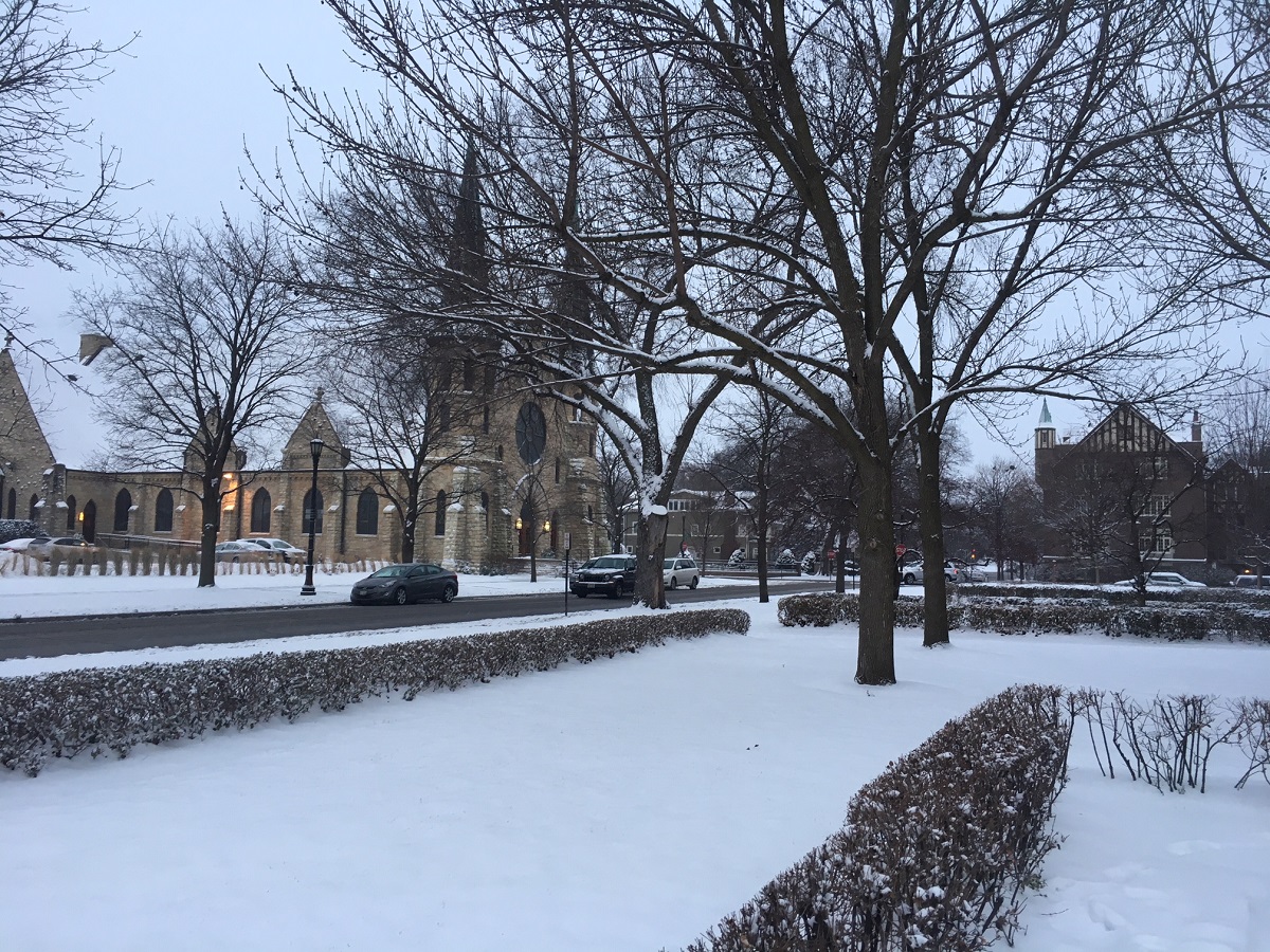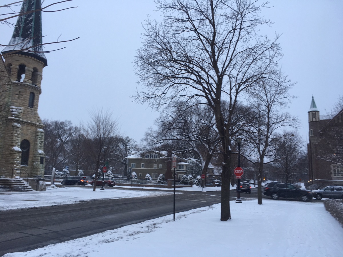 Looking southwest on Lake with St. Francis church on left and fancy tower condo on right