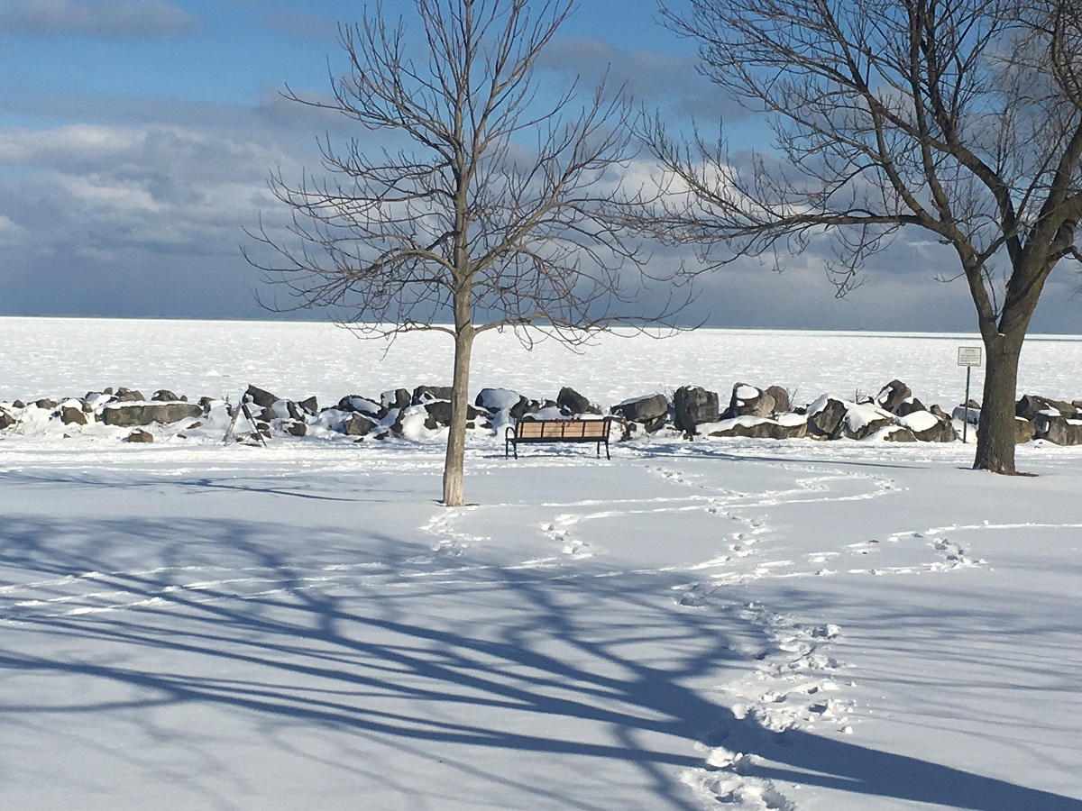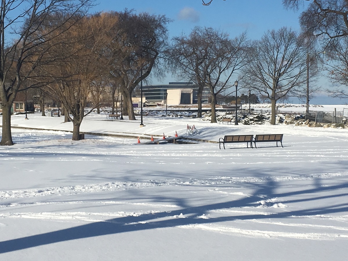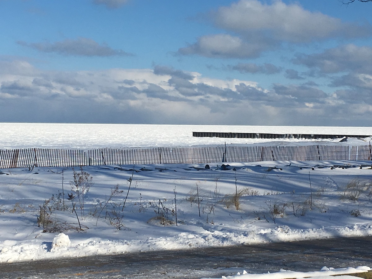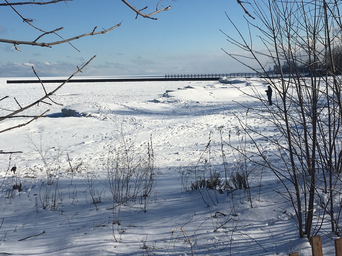 Andy XC skiing looking south from Elliott Park, Evanston at Lee Street Beach with big bluffs of snow