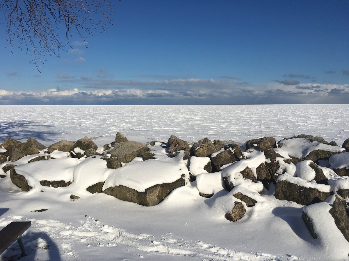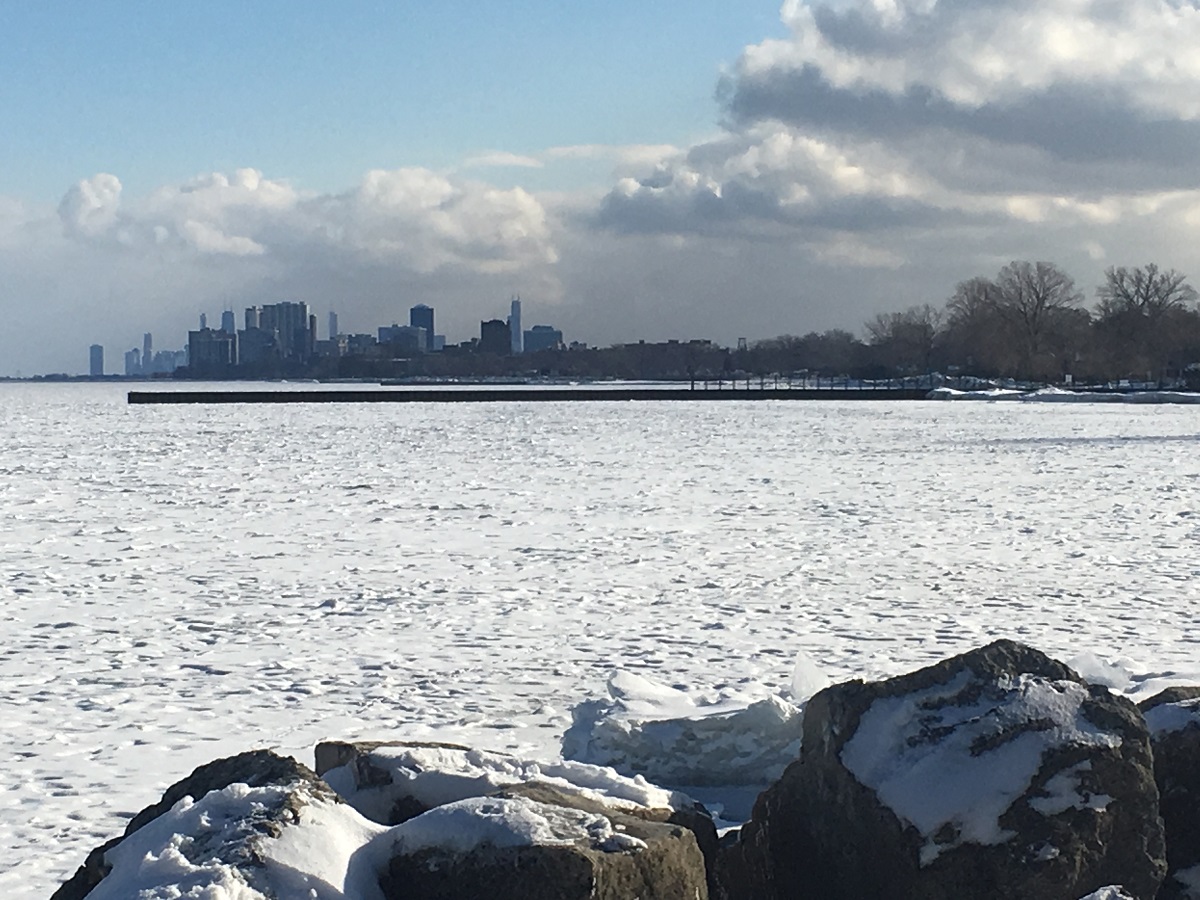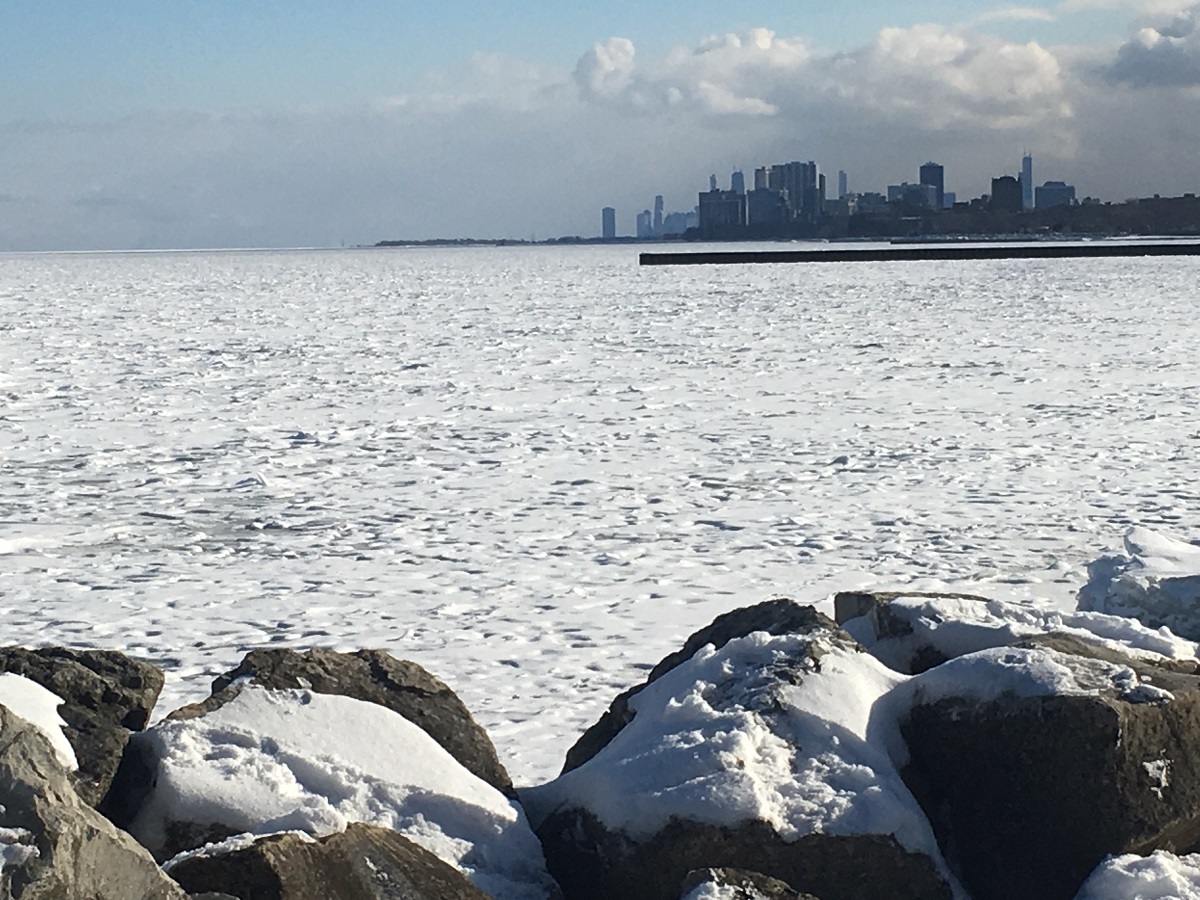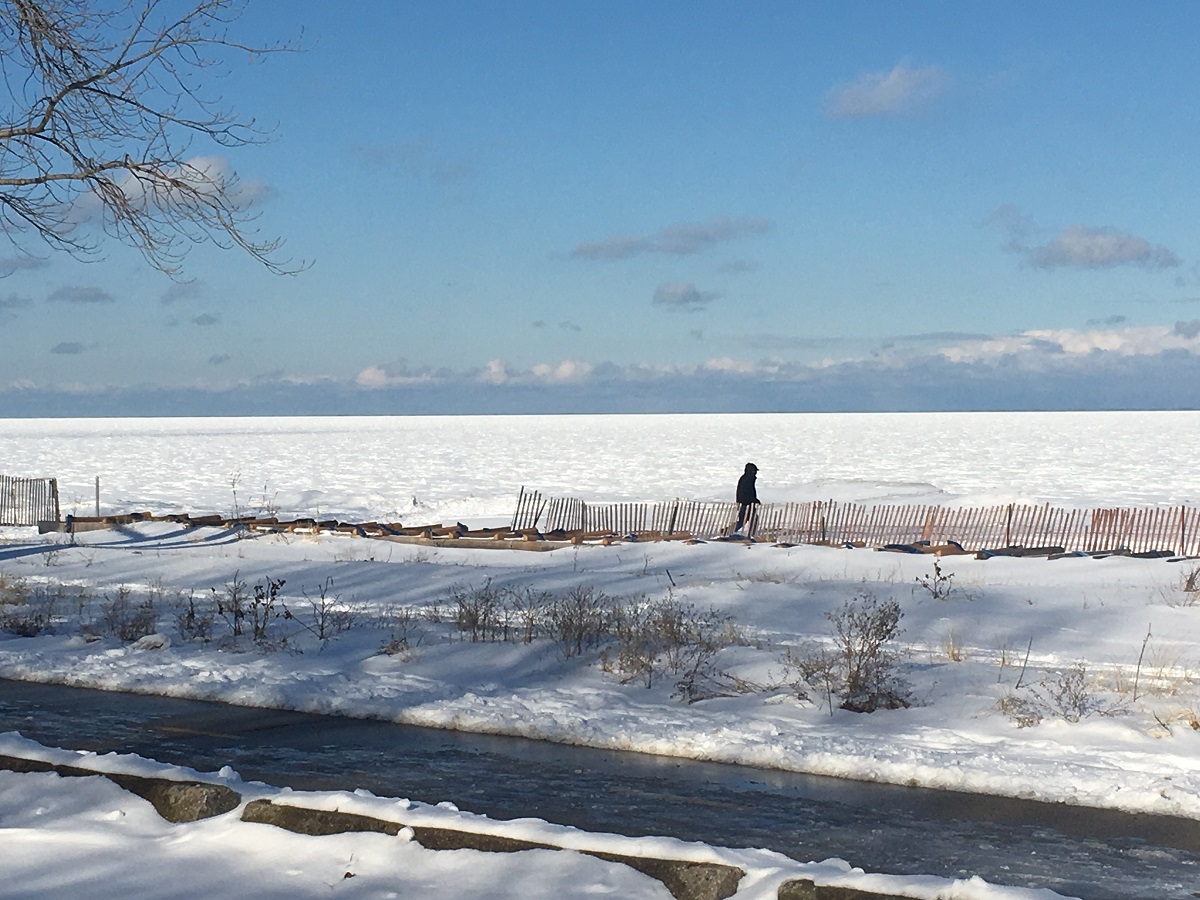 Andy XC skiing looking east from Elliott Park, Evanston at frozen Lake Michigan