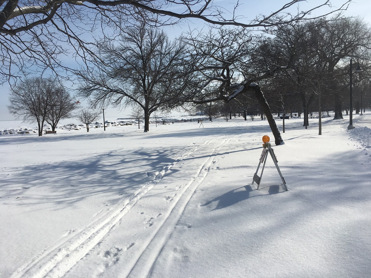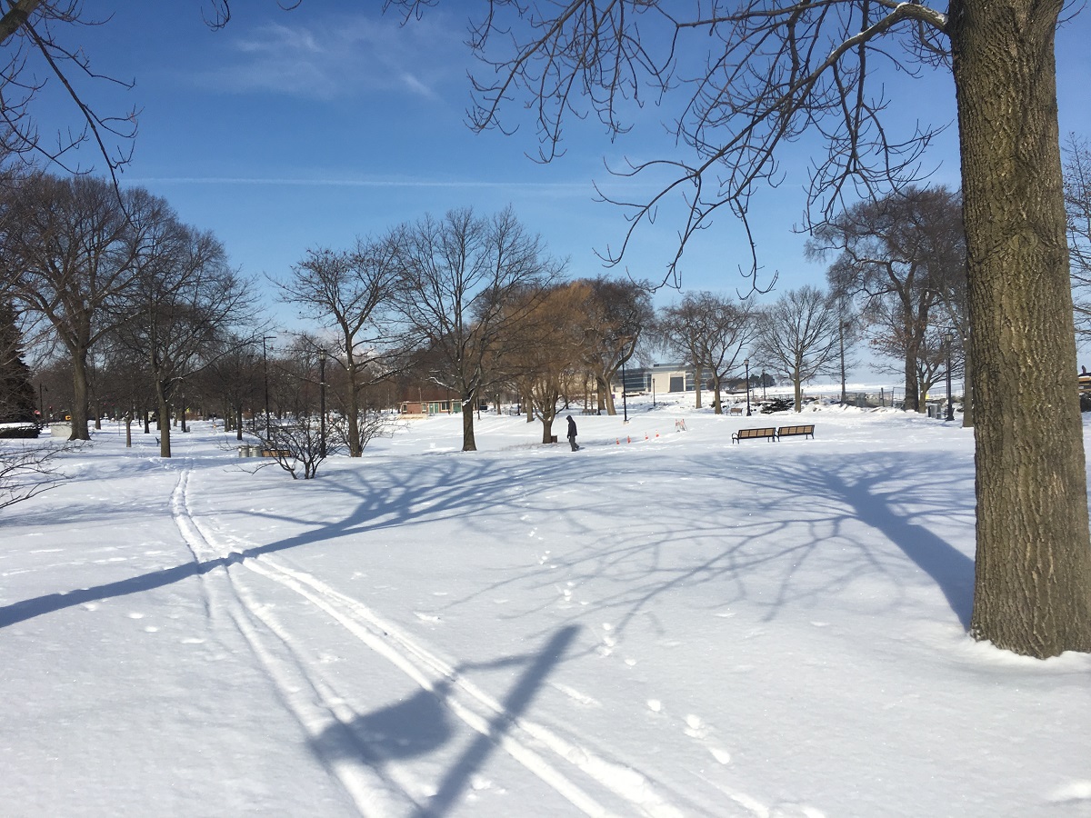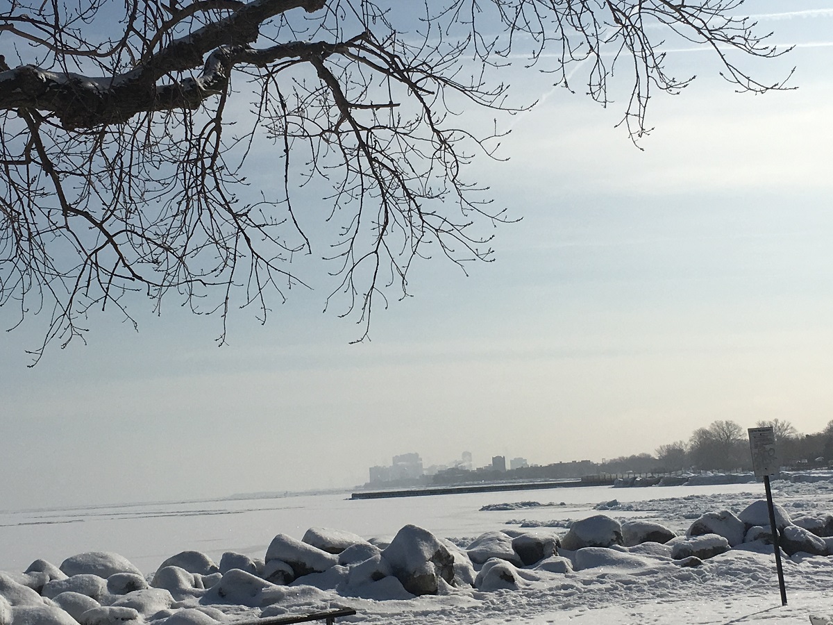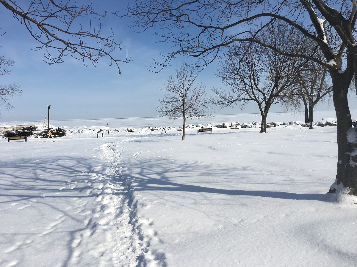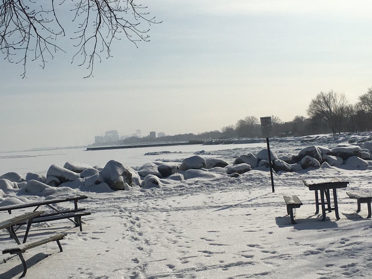 Dawes Park looking east to frozen Lake Michigan