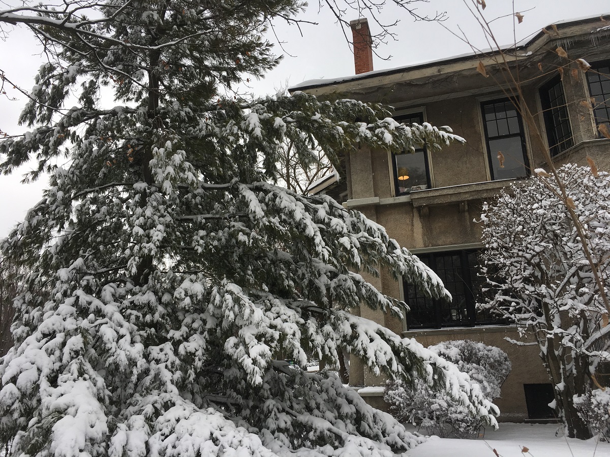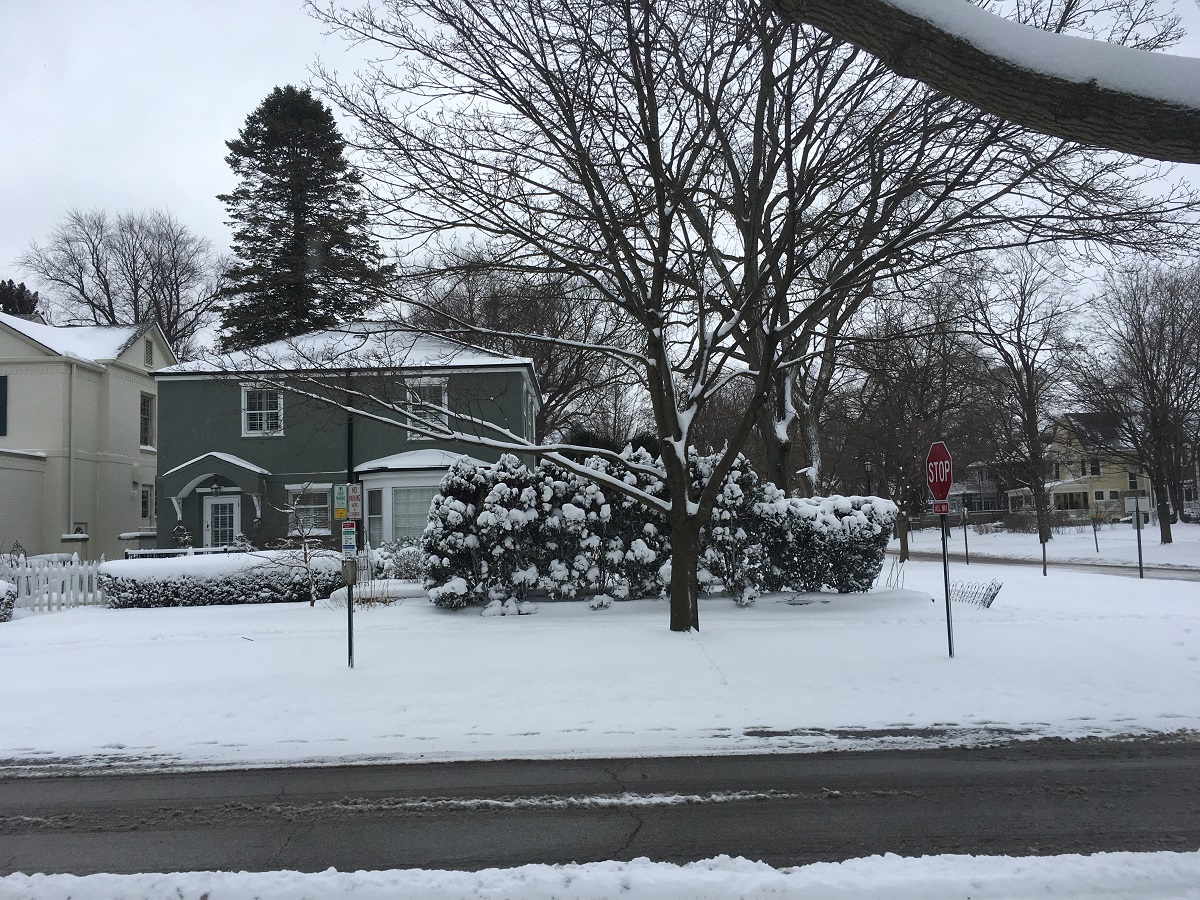 Snow trimming trees and bushes on Davis Street