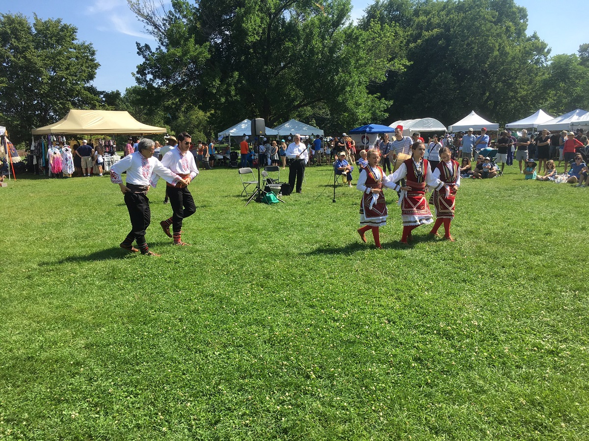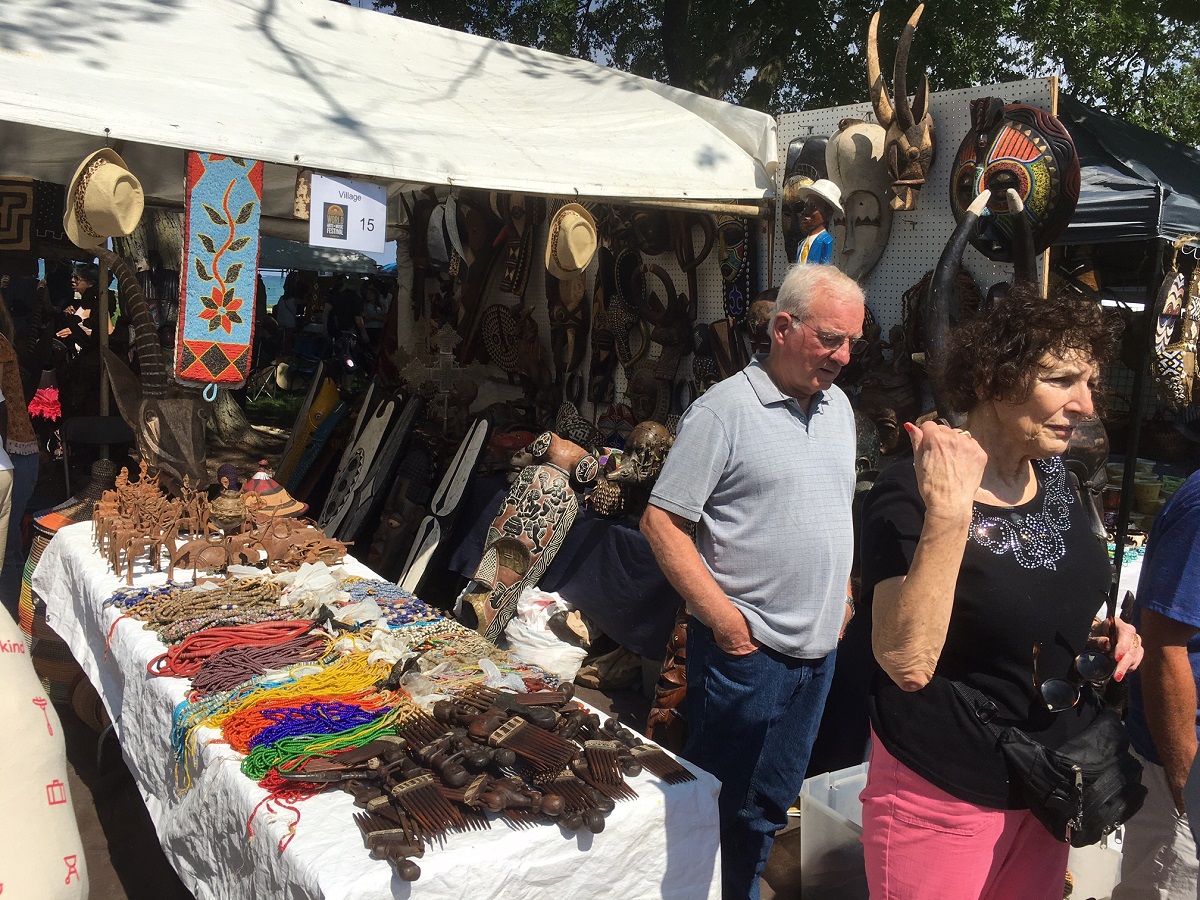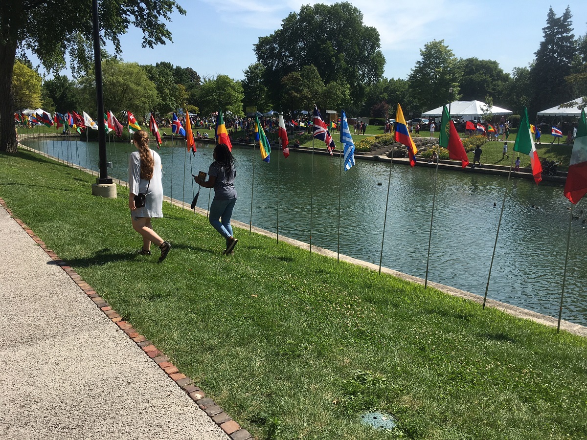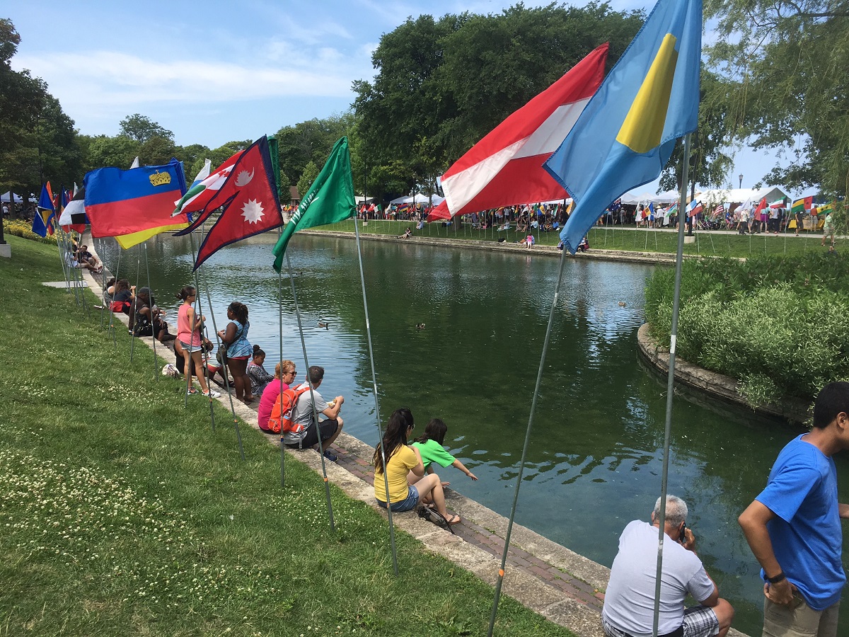 Flags, booths, and people sitting all around lagoon