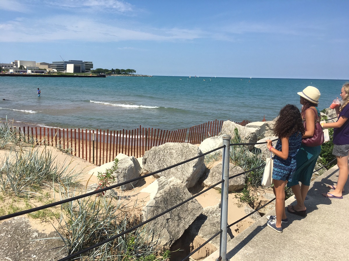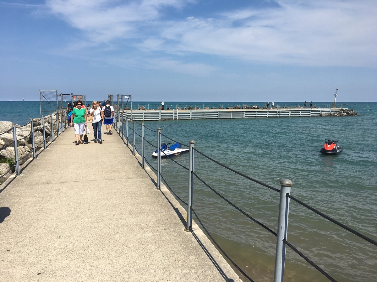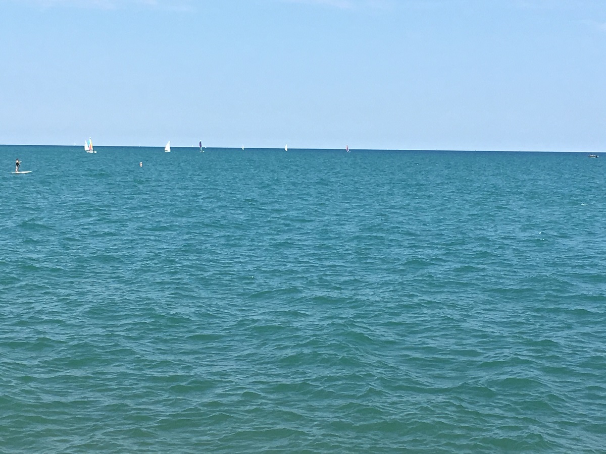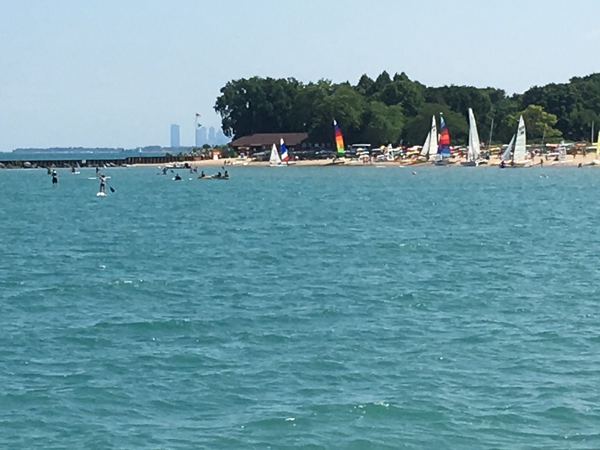 Northwestern new buildings, sailboats, and people from the pier they opened up