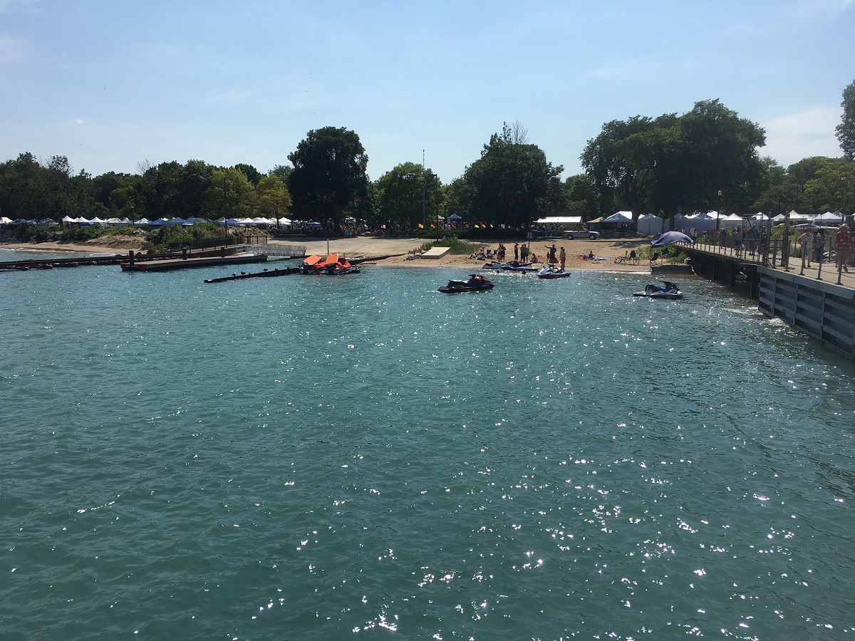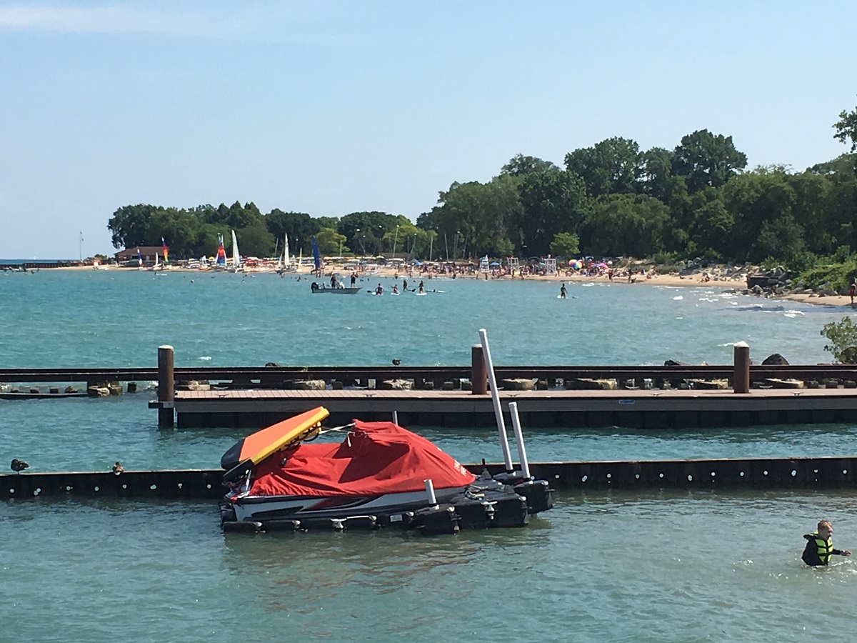 A zoom photo showing Lake Piont Tower beyond Dempster Beach from the end of the pier