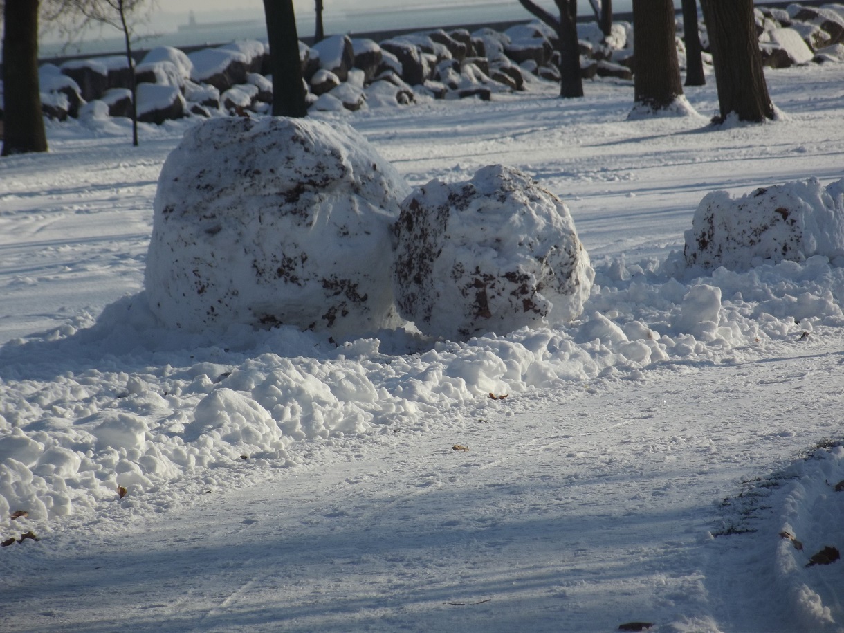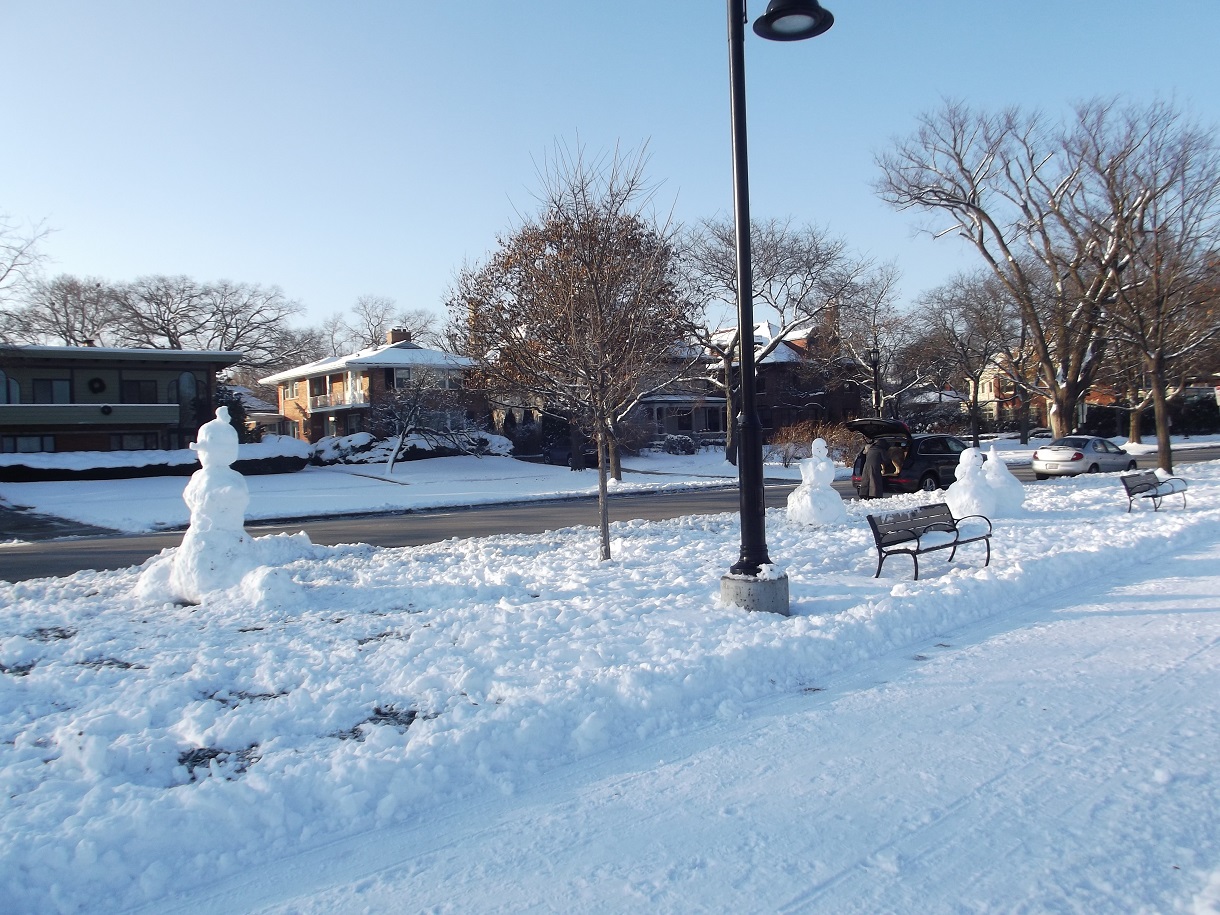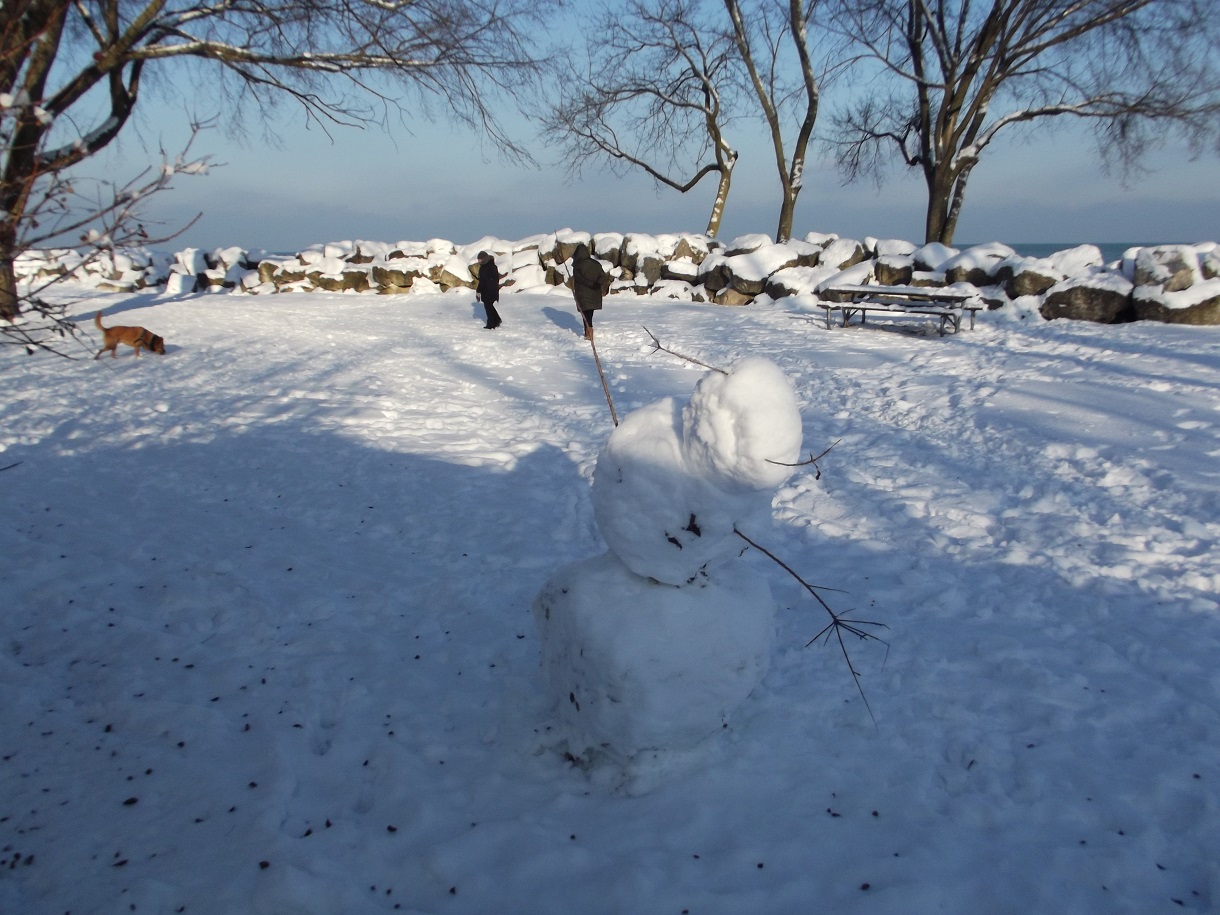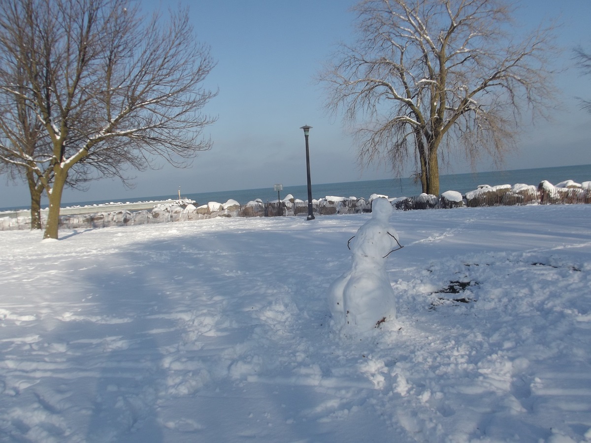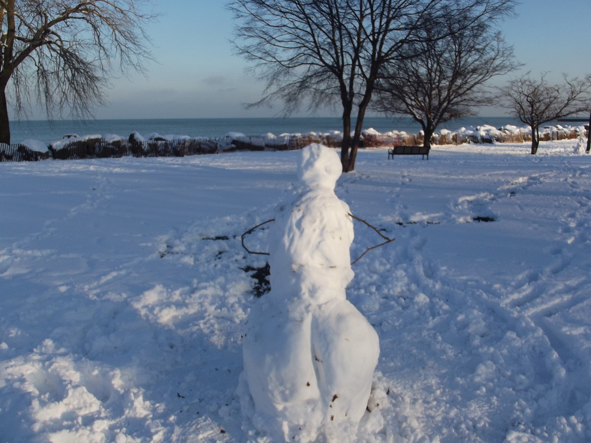 Snowman with Lake Michigan just south of lagoon in Dawes Park