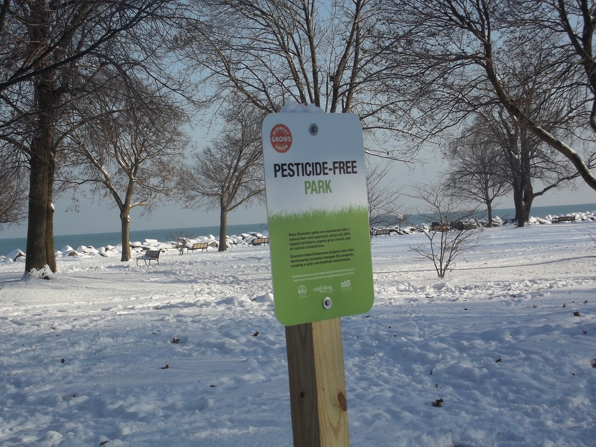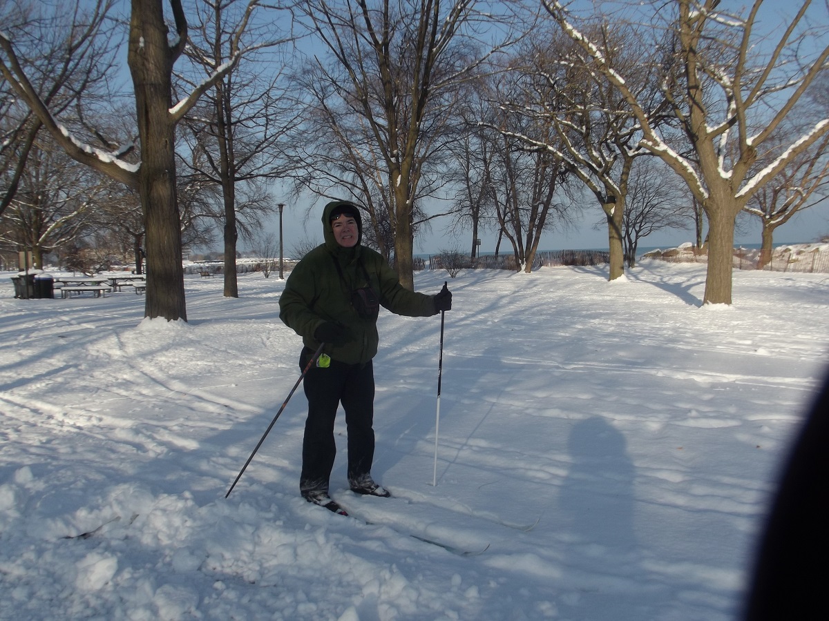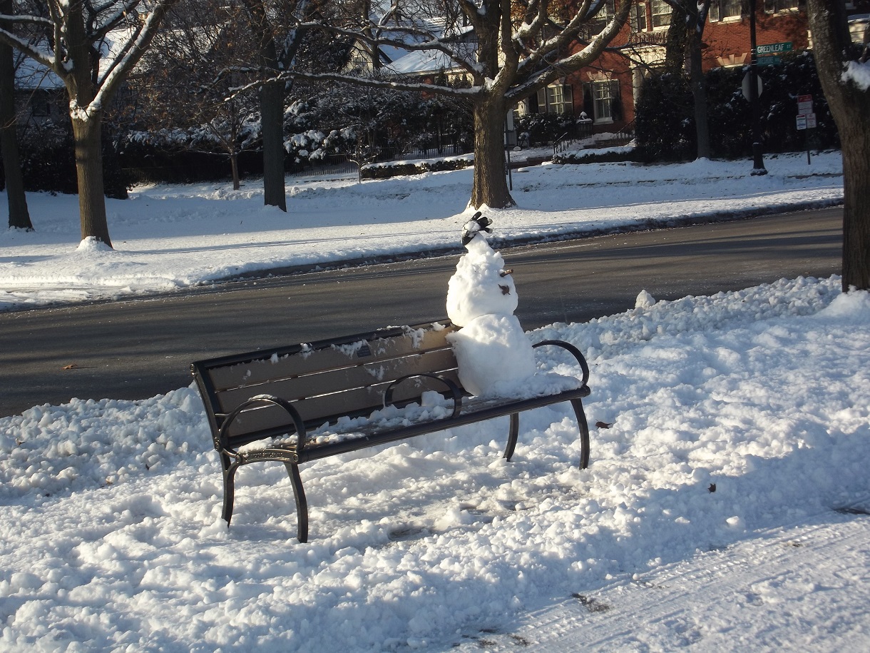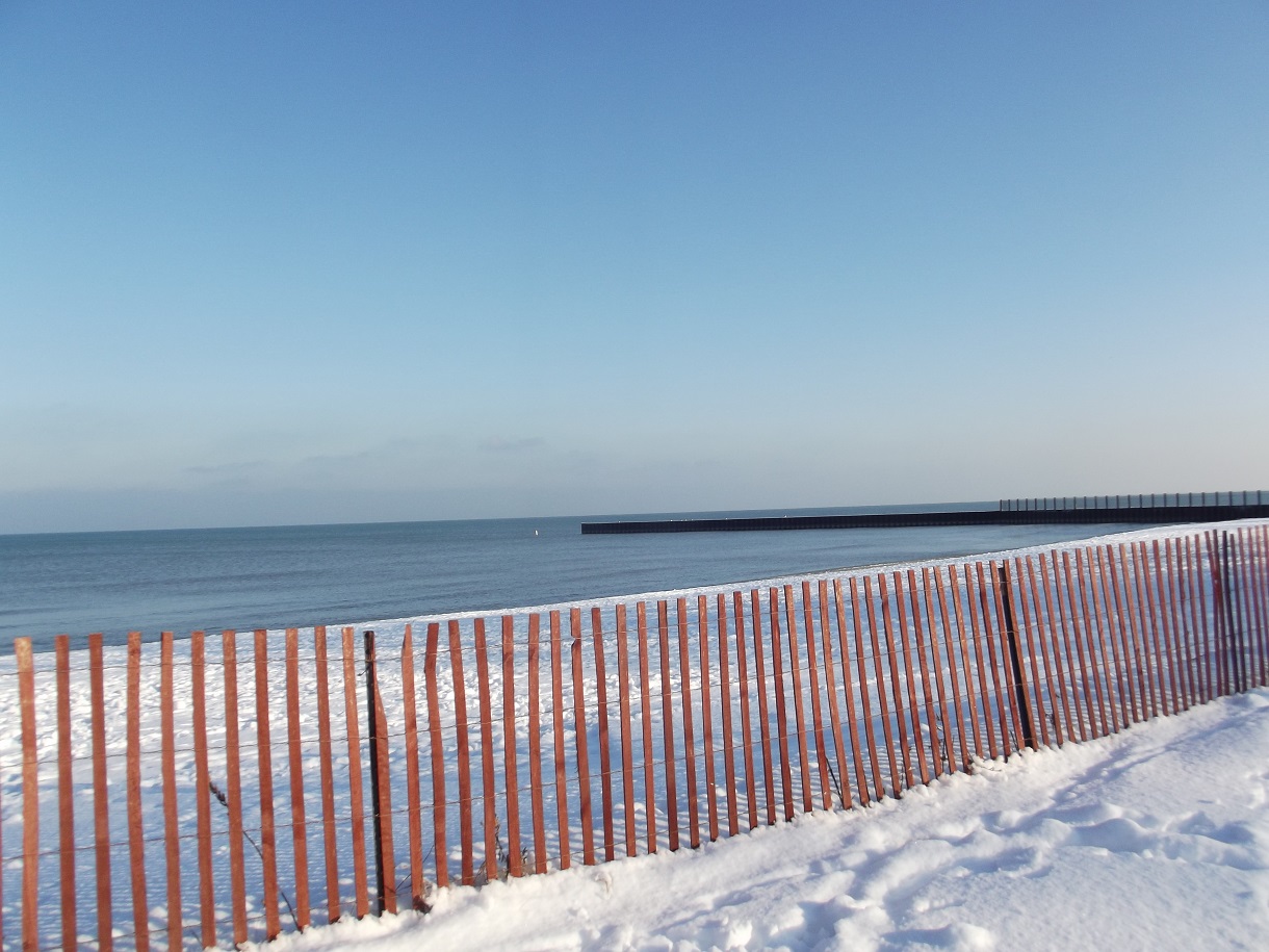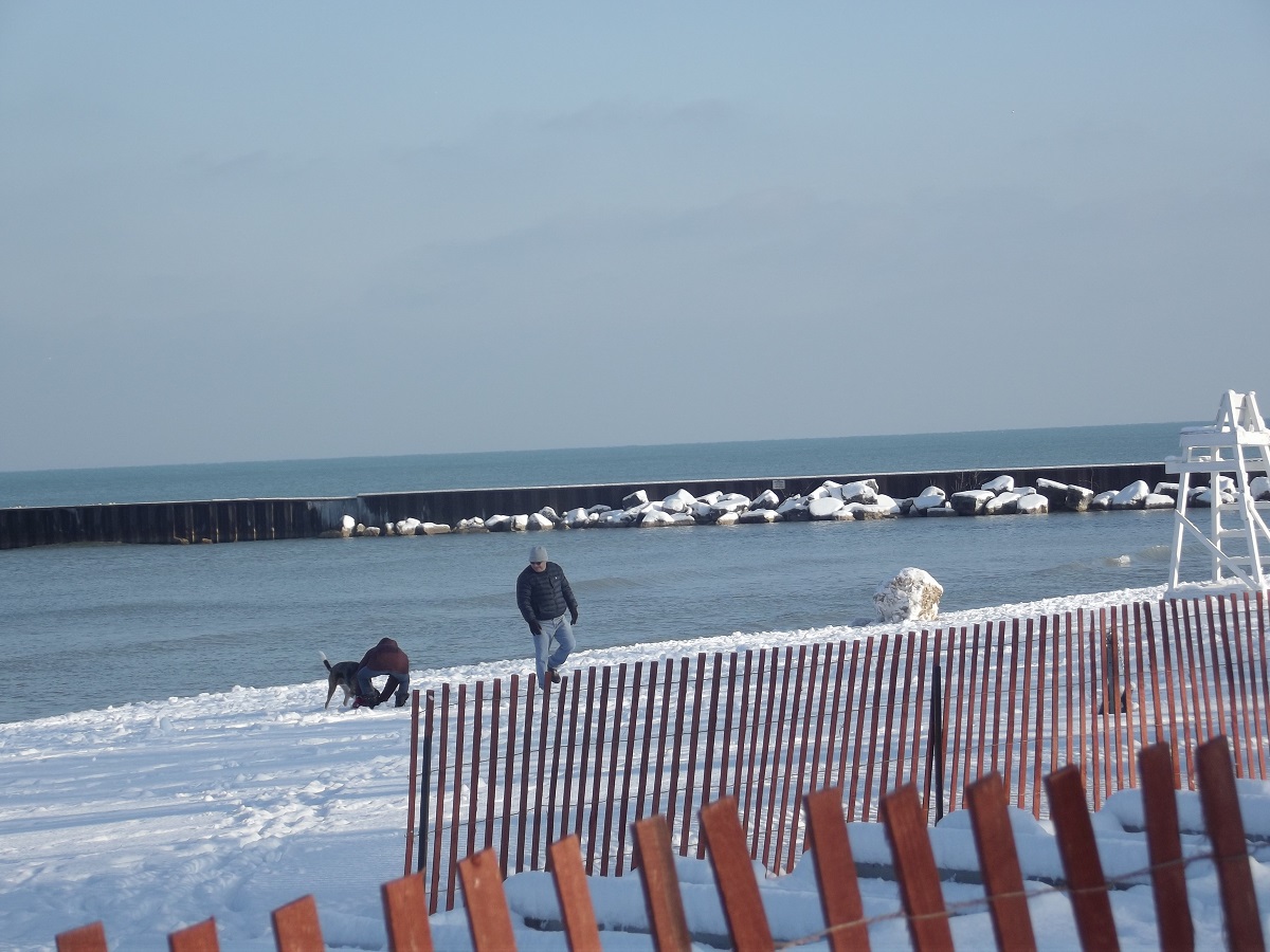 Snowman with Lake Michigan just south of lagoon in Dawes Park