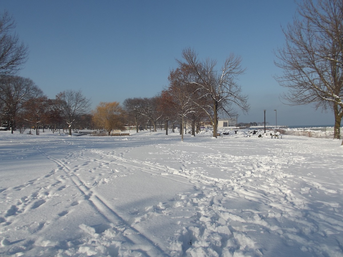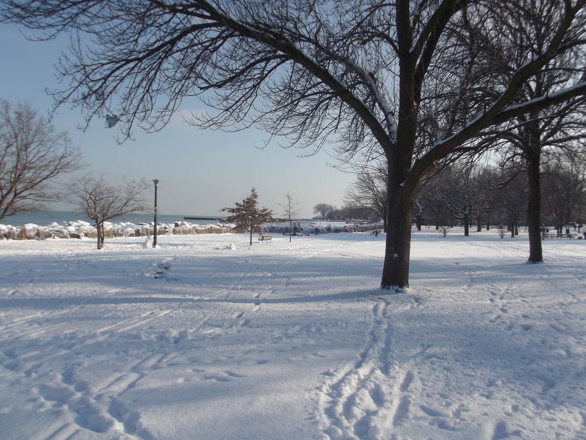 Looking north to lagoon and Northwestern showing many trees trimmed with snow
