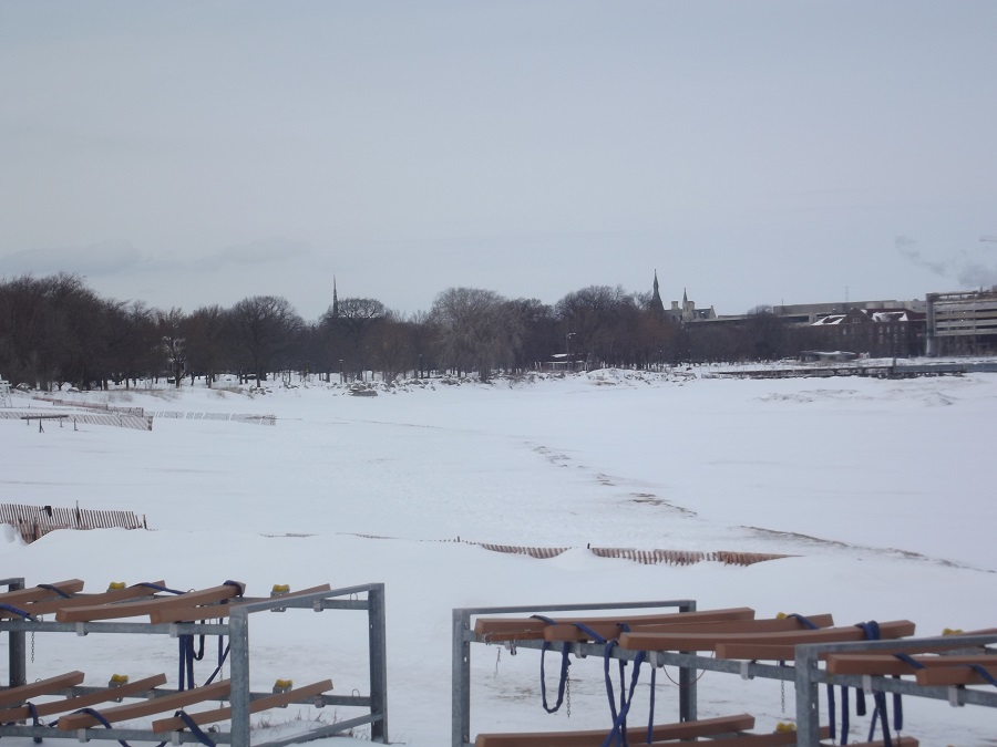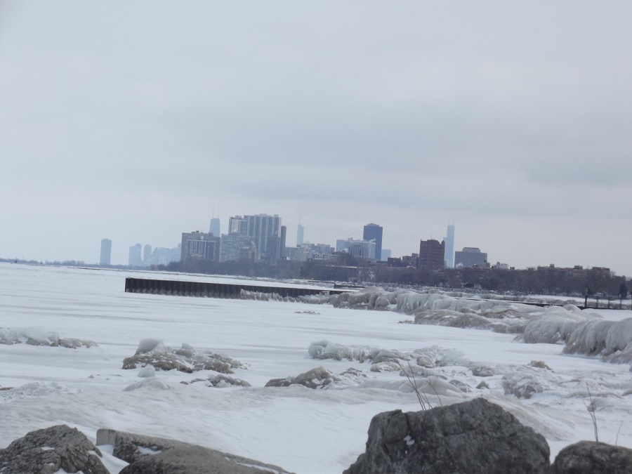 Looking south to Downtown Chicago showing huge ice formations from Lee Beach fence -- as far south as I skiied