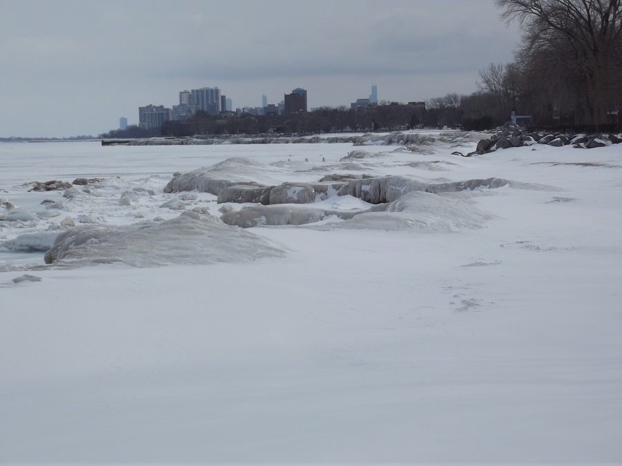 Looking south to Downtown Chicago showing huge ice formations and Lee Beach breakwater