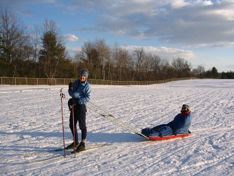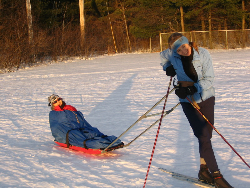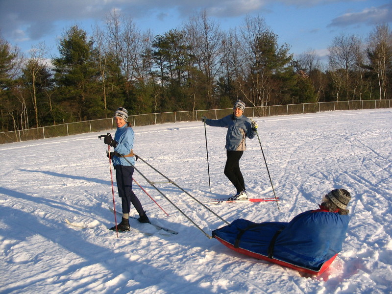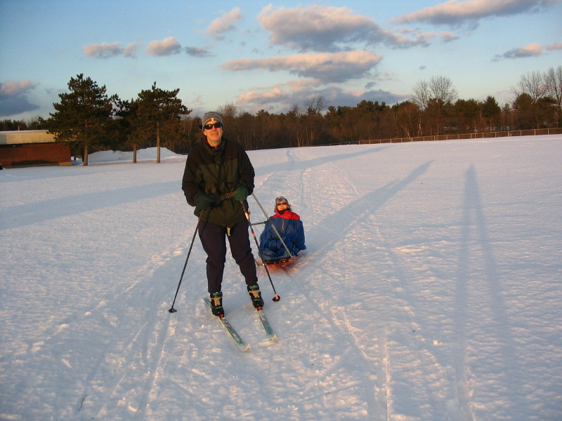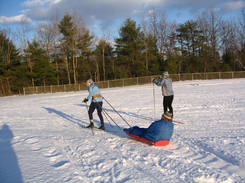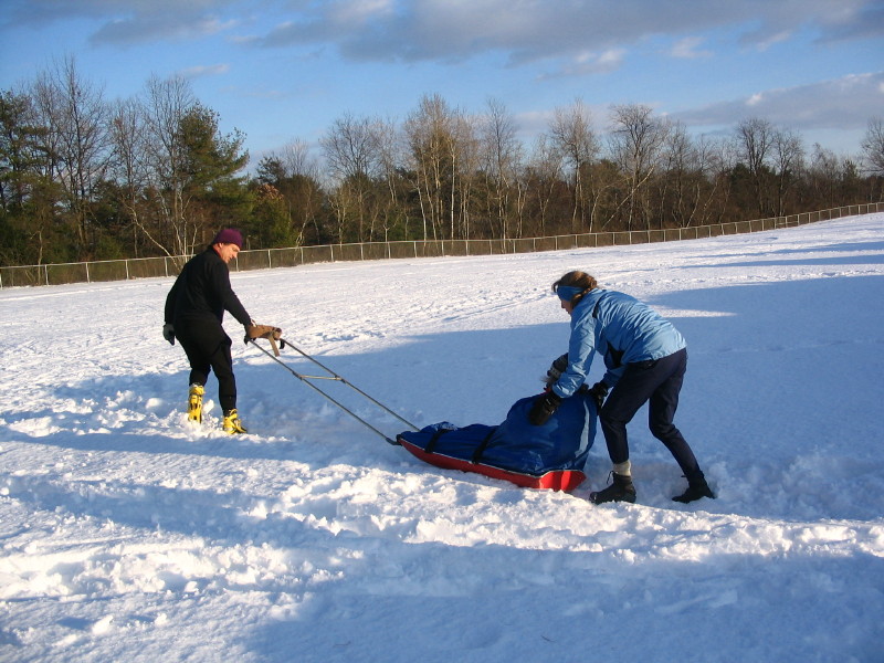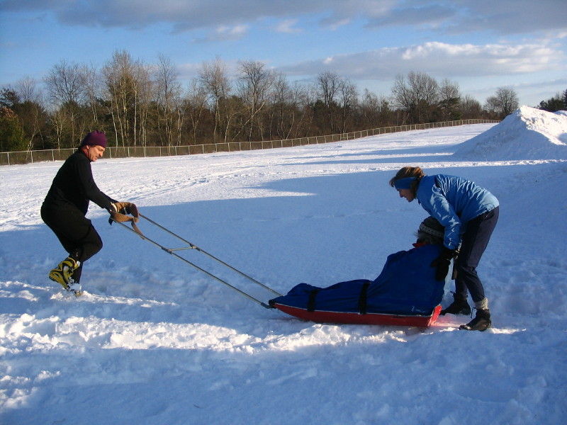 Towing Marjorie on sled at Queensbury School -- 12/25/08